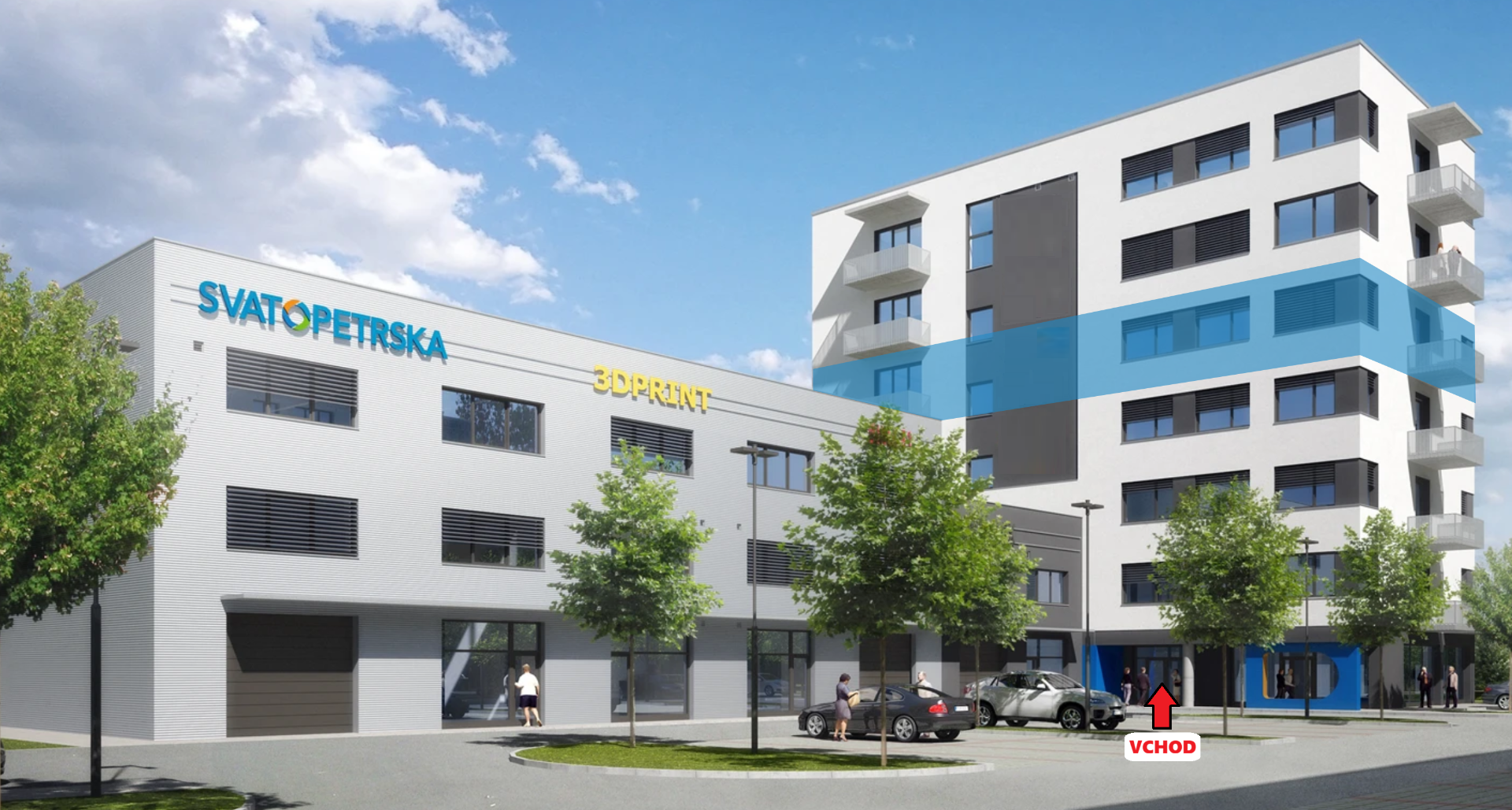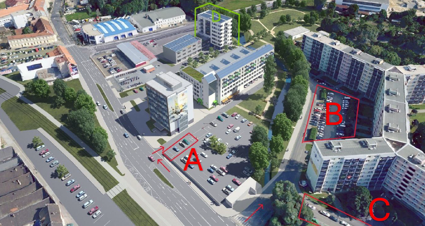 Přes silnic je to do areálu Svatopetrská a k budově D jen pár minut chůze.